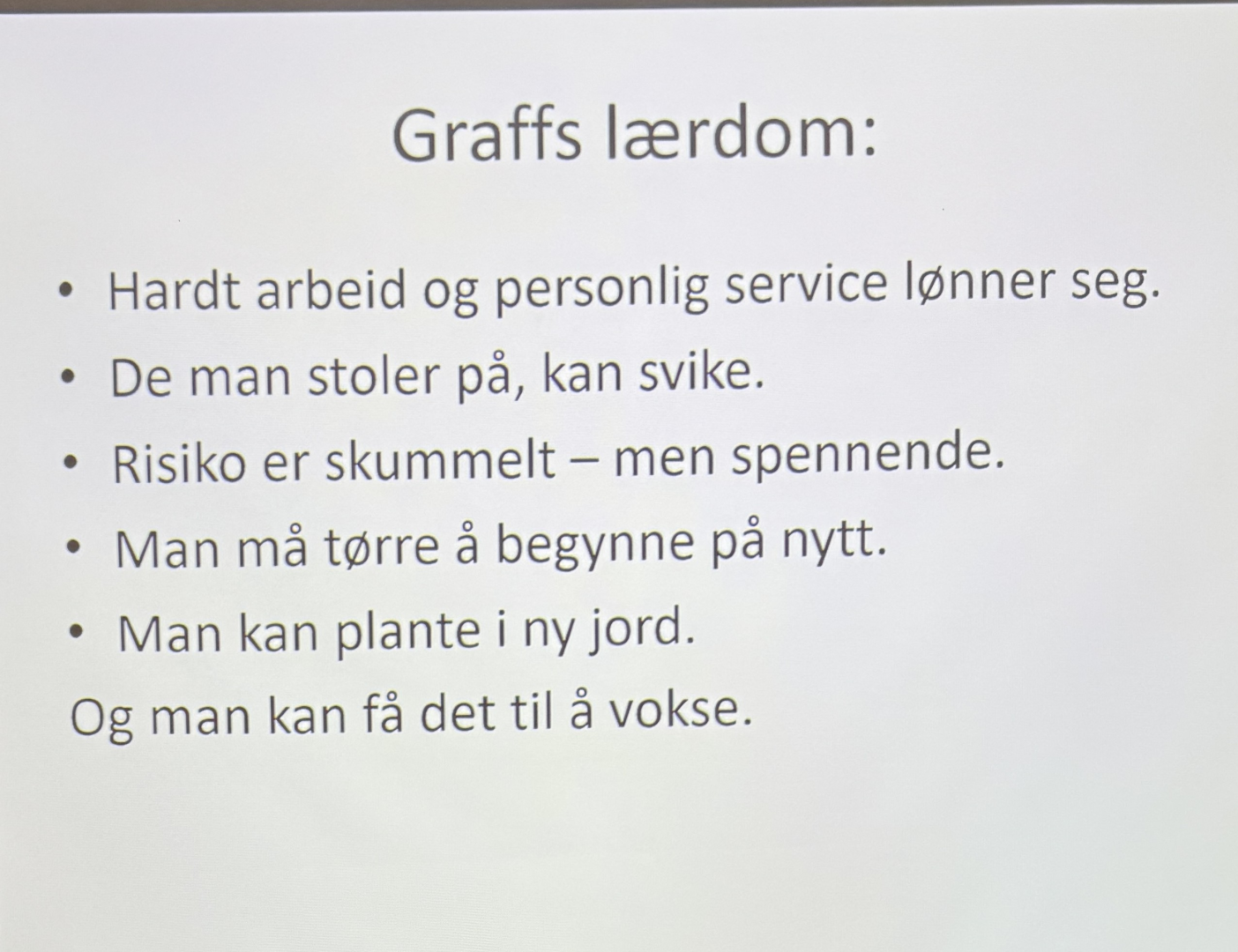 Graff Regnskap og Rådgivning. Jobber 50/10 min pause til hva du vil. Godt arbeidsmiljø smitter. 4 dagers arbeidsuke – samme lønn. Jobber mye med oppstartsbedrifter. Hjelper med det smågründere trenger. Lager database over småbedrifter.